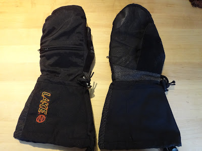 My ultimate mittens are a pair I got with my Lake boots years ago. Naturally, they are no longer available! They have a nice warm fleecy lining, and a heavy canvas outer. They are roomy enough to use with a moderately thick glove liner. And they have a little zippered pocket for one of those disposable hand warmers. They have some reflective material on the sides, which faces back when my hands are on the hoods. These are good for temps below 25F. I've used these many times in single digit temperatures.