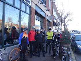 But the crew that gathered at Ride Studio Cafe for the ride at 10AM this morning was not to be deterred by mere cold temperatures. The place was packed with eager cyclists when I arrived. Henry and Geoff again graciously agreed to serve as super-domestiques for the fast riders.